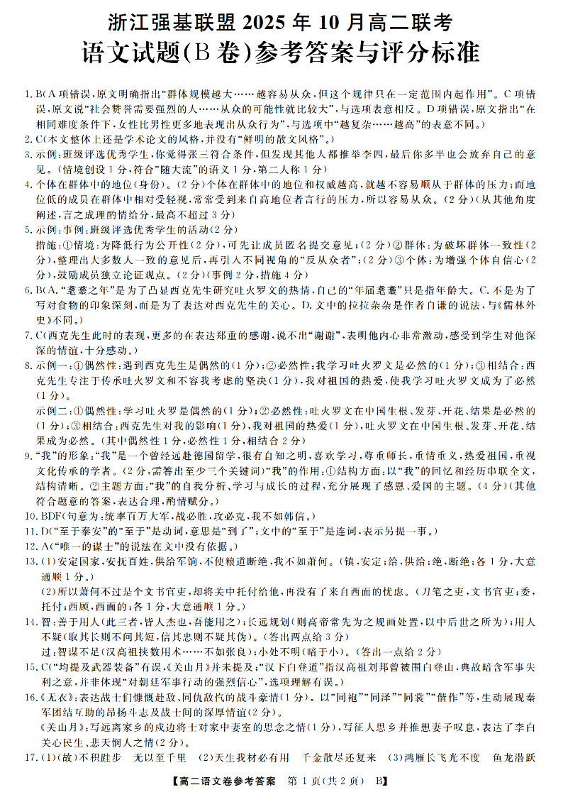 高二语文答案--浙江省强基联盟2025-2026学年高二上学期10月联考B卷