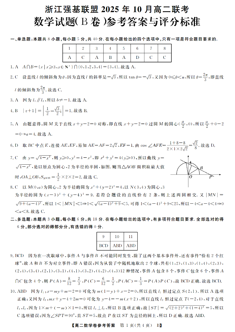 高二数学答案--浙江省强基联盟2025-2026学年高二上学期10月联考B卷