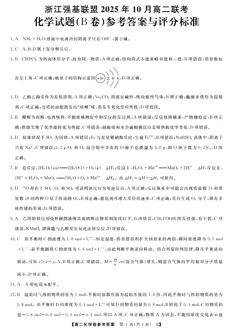 高二化学答案--浙江省强基联盟2025-2026学年高二上学期10月联考B卷