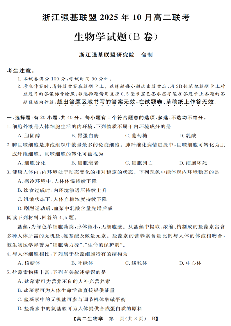 高二生物--浙江省强基联盟2025-2026学年高二上学期10月联考B卷