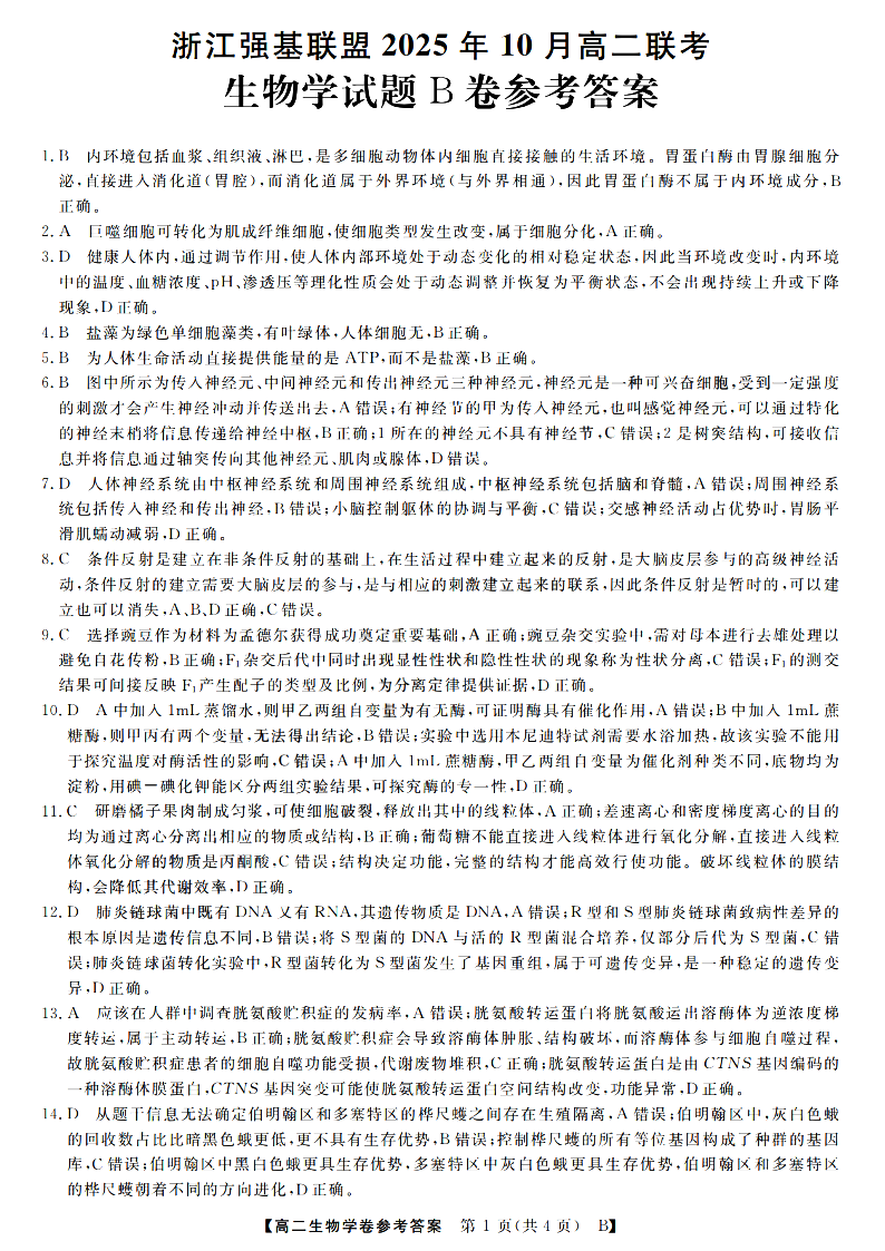 高二生物答案--浙江省强基联盟2025-2026学年高二上学期10月联考B卷