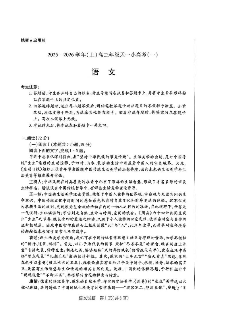 高三语文--河南省天一大联考2026届高三(上)天一小高考(一)