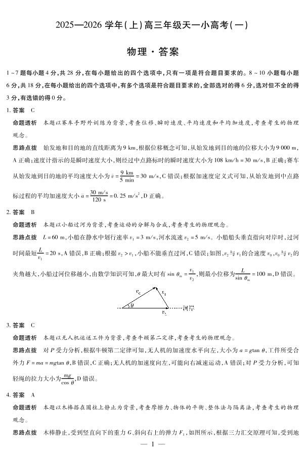 高三物理答案--河南省天一大联考2026届高三(上)天一小高考(一)