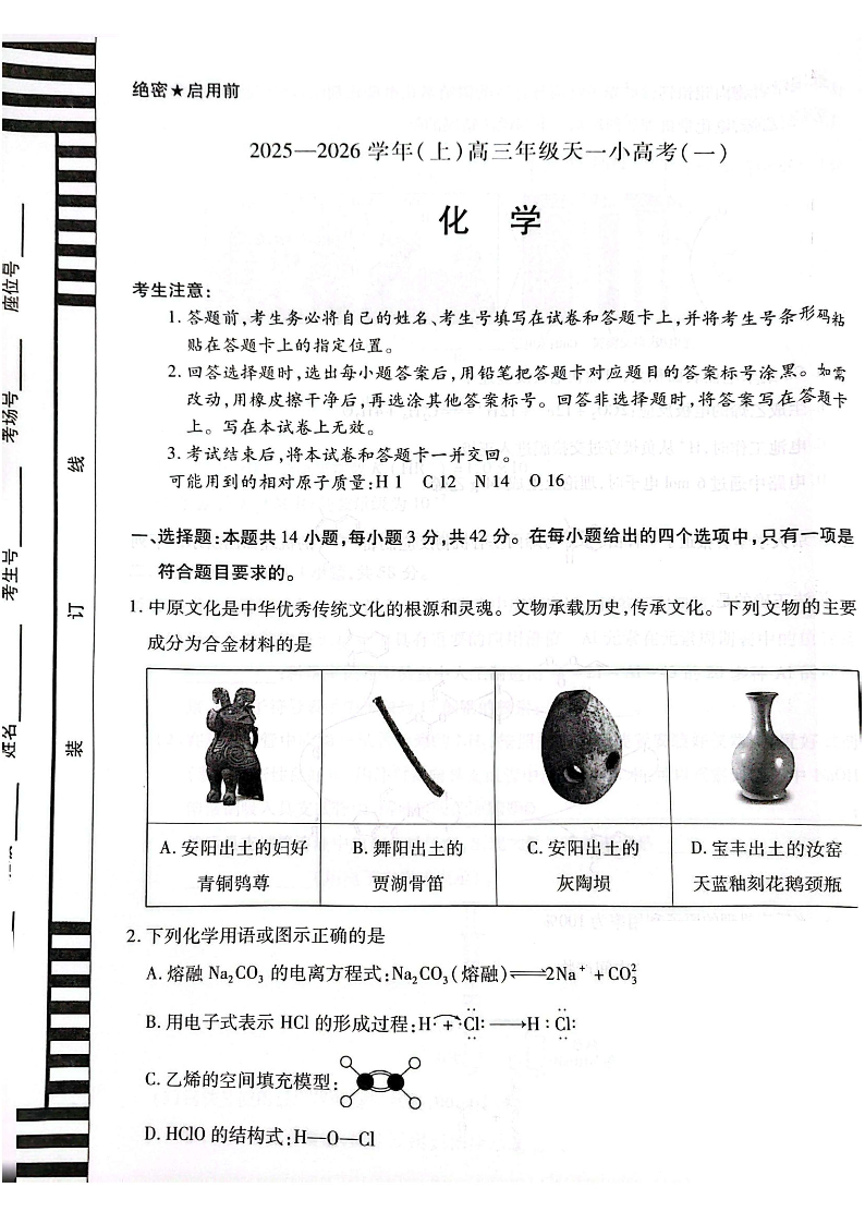 高三化学--河南省天一大联考2026届高三(上)天一小高考(一)