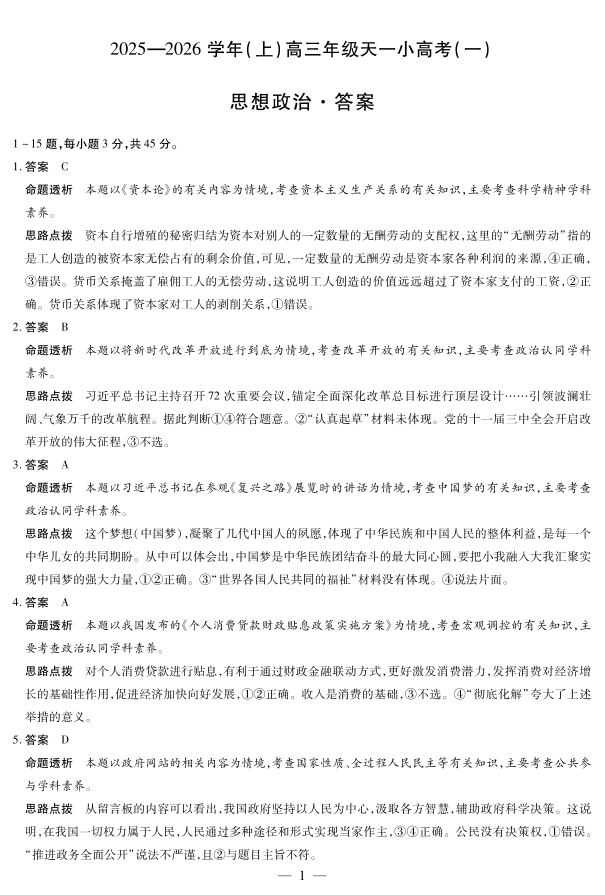 高三政治答案--河南省天一大联考2026届高三(上)天一小高考(一)