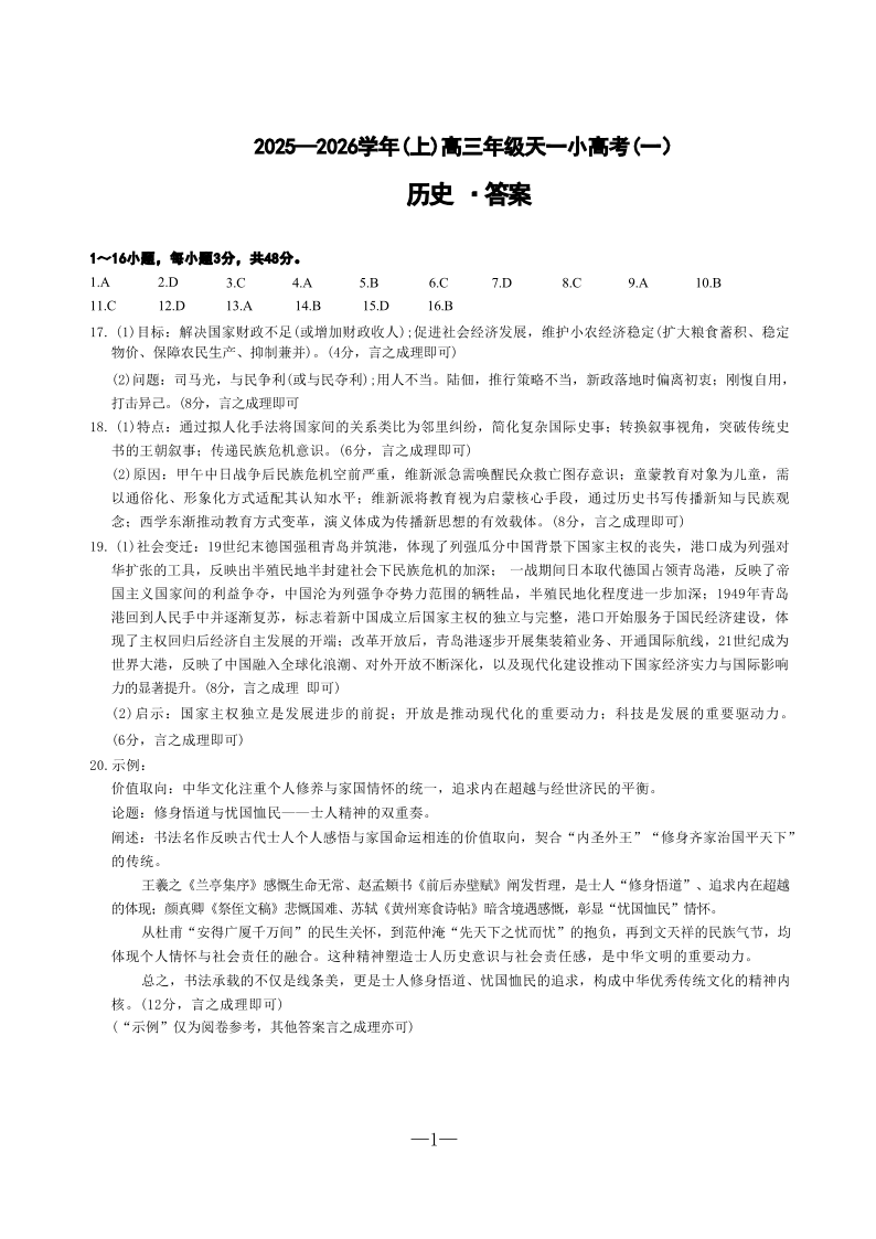 高三历史答案--河南省天一大联考2026届高三(上)天一小高考(一)