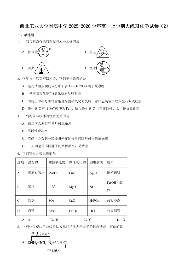 高一化学+答案--陕西省西北工业大学附属中学2025-2026学年高一上学期大练习(二)