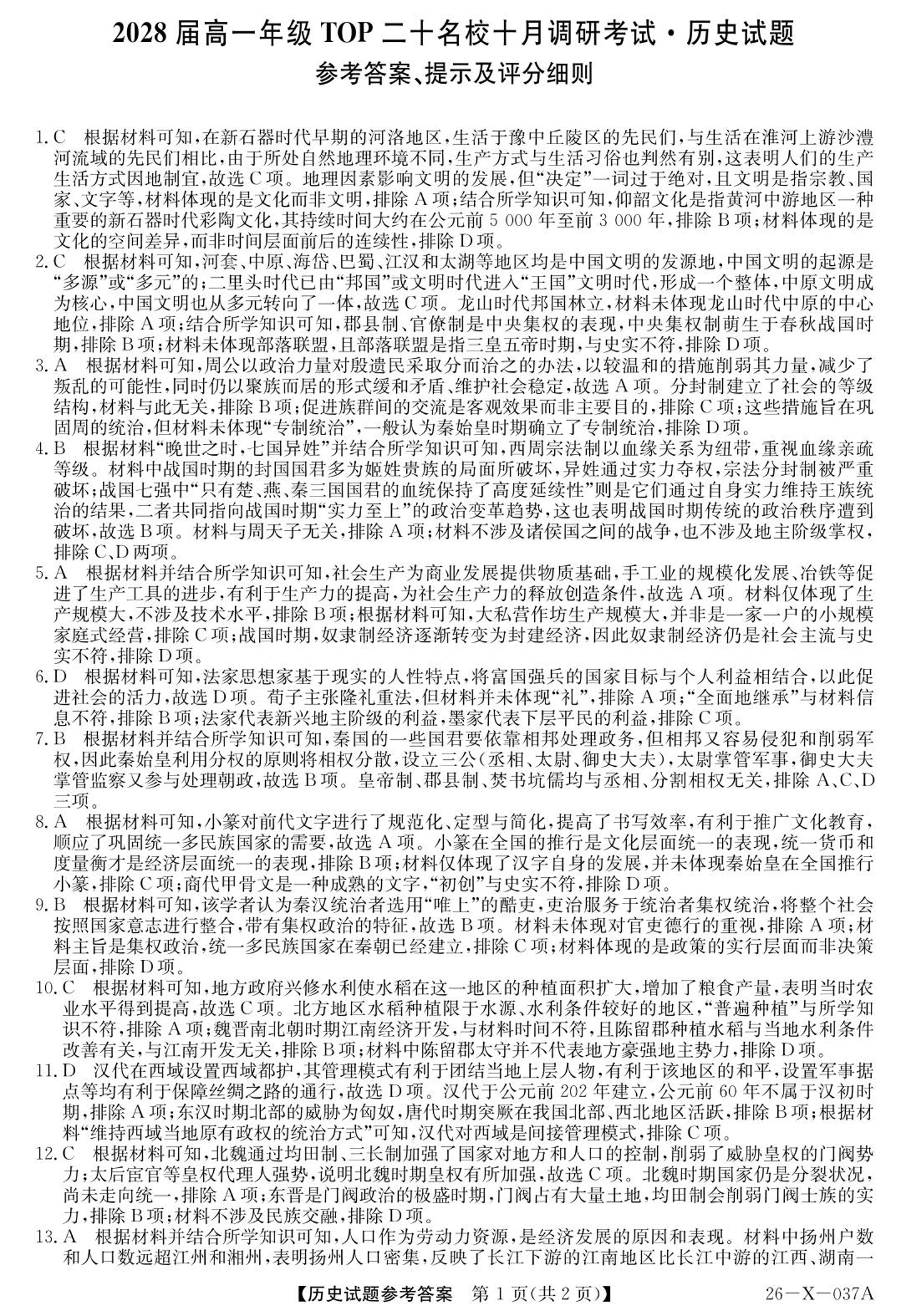 高一历史答案--河南省TOP二十名校2025-2026学年高一上学期10月调研考试