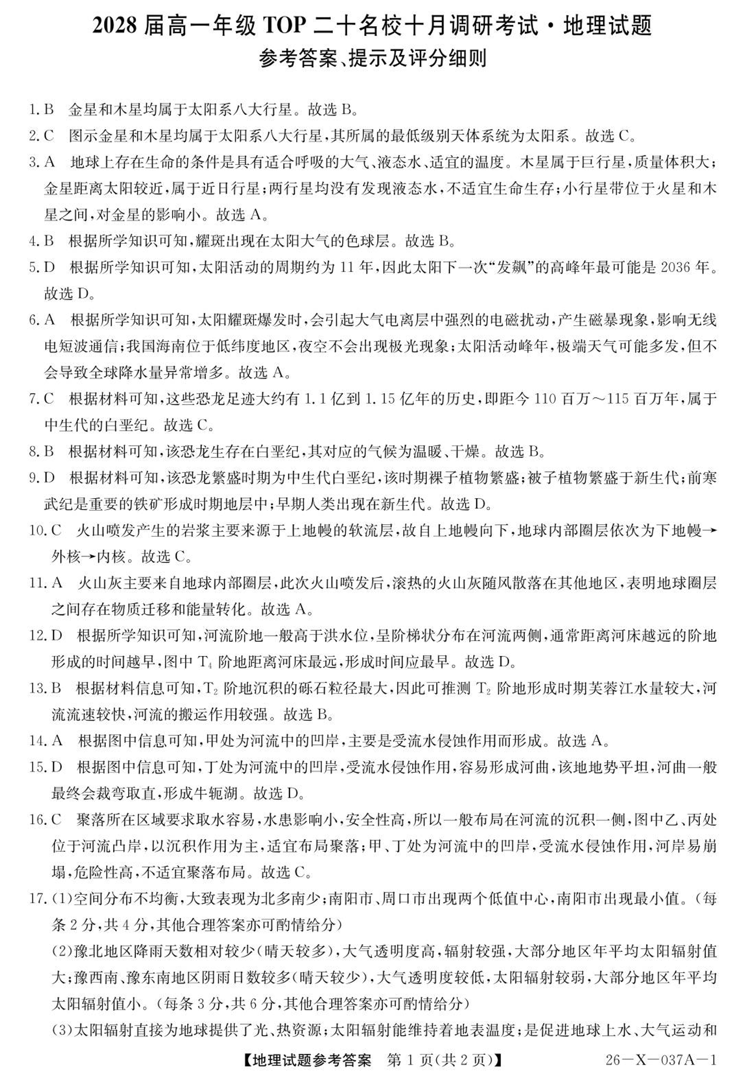 高一地理答案--河南省TOP二十名校2025-2026学年高一上学期10月调研考试