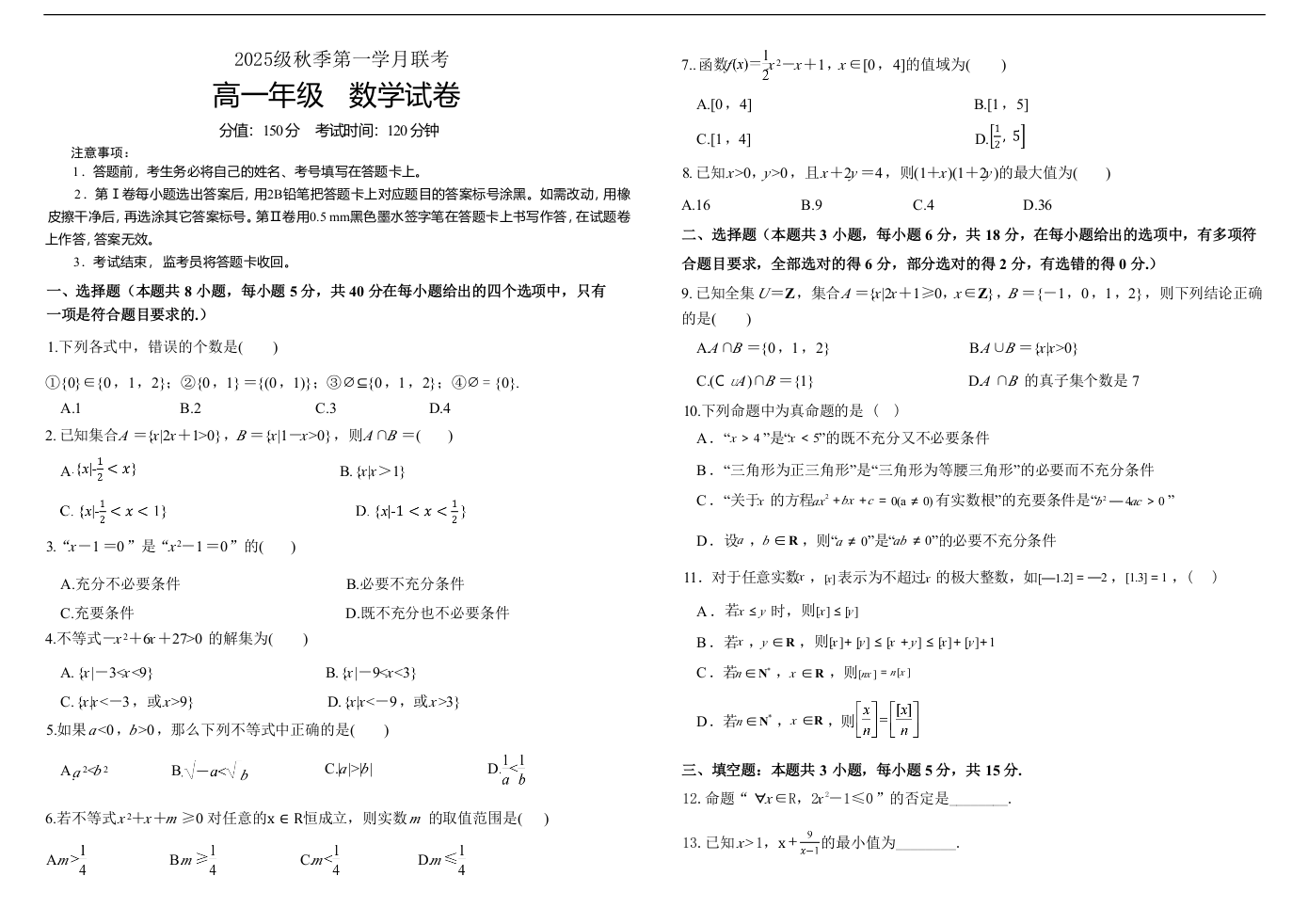 高一数学+答案--河南省天立教育集团2025-2026学年高一上学期10月联考