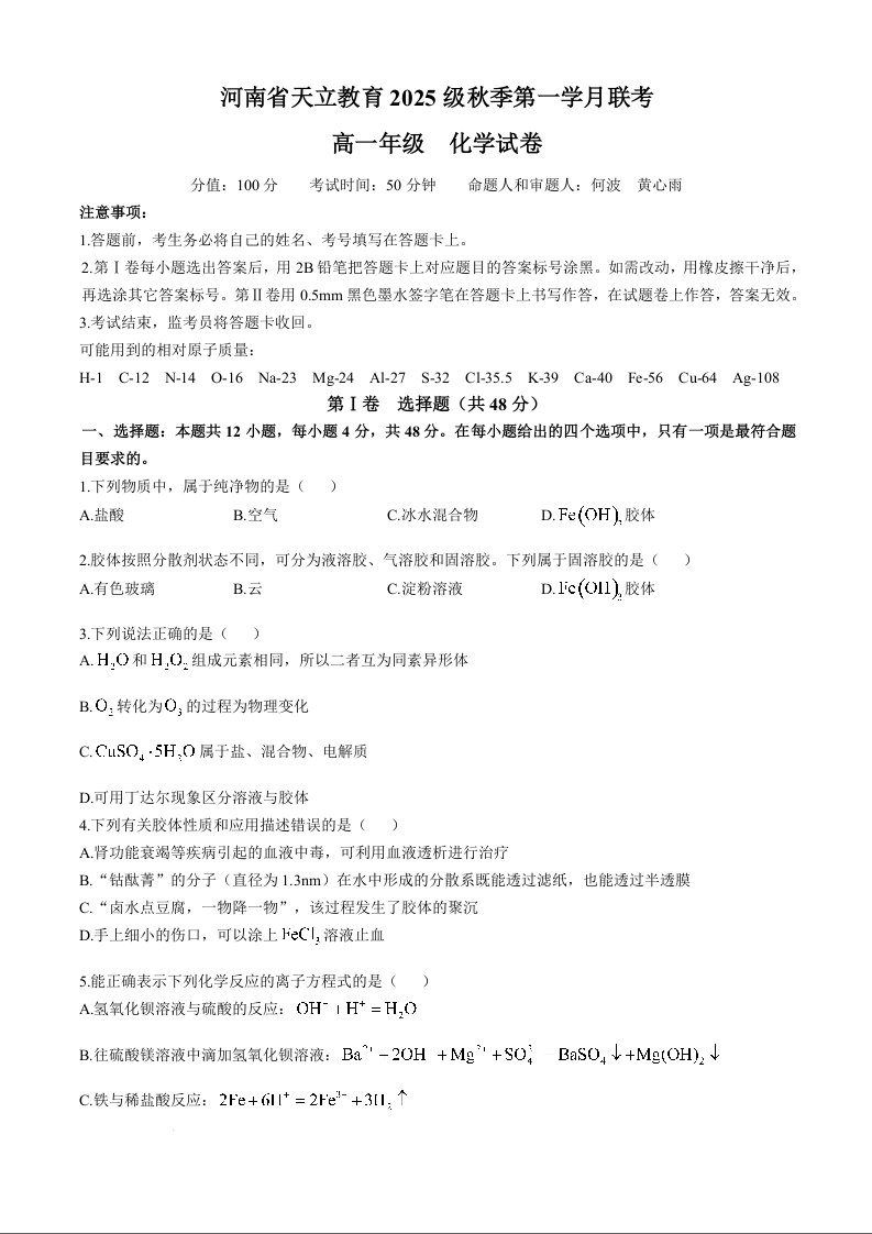 高一化学+答案--河南省天立教育集团2025-2026学年高一上学期10月联考