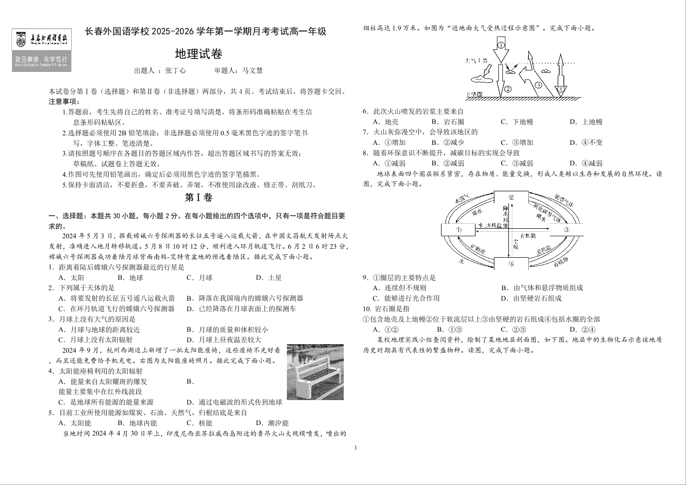 高一地理+答案--吉林省长春外国语学校2025-2026学年高一上学期10月第一次月考