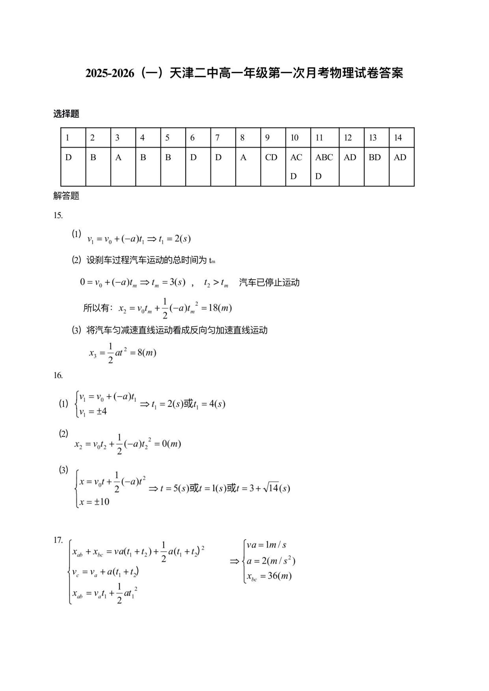 高一物理答案--天津市第二中学2025-2026学年高一上学期第一次月考