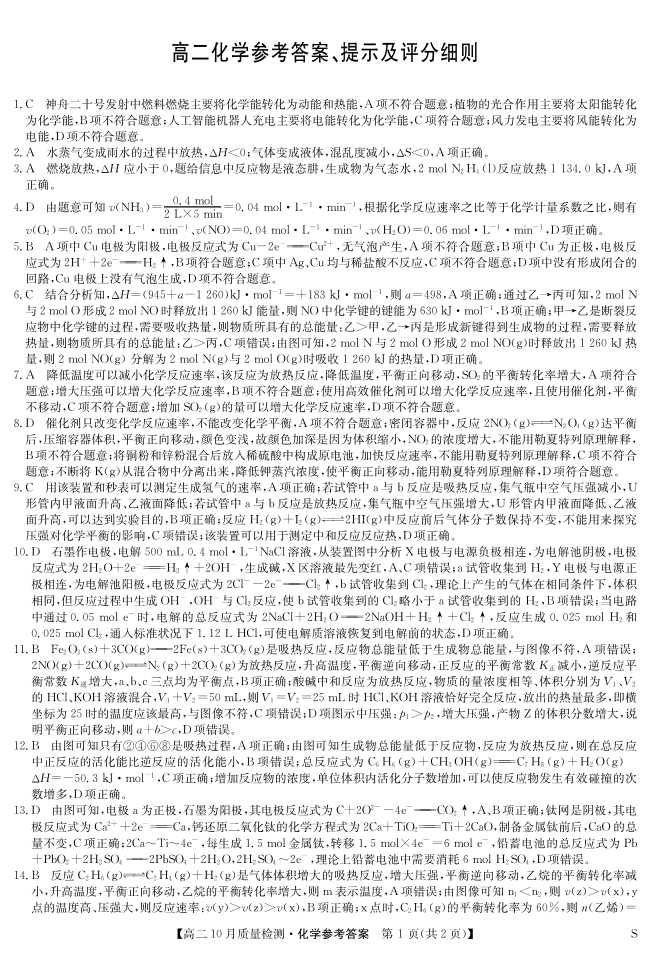 高二化学答案--河北省保定市八校2025-2026学年高二上学期10月月考