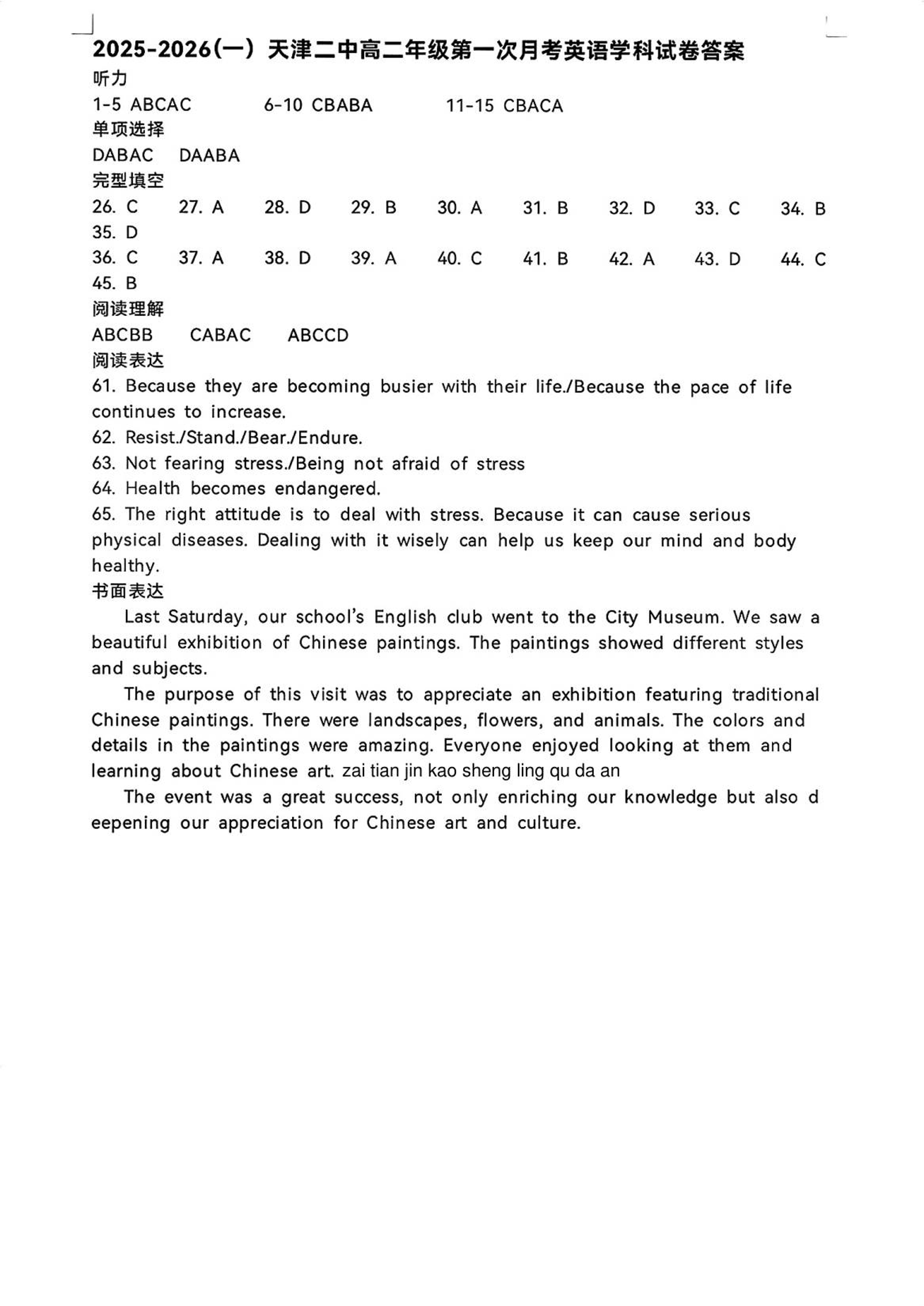 高二英语答案--天津市第二中学2025-2026学年高二上学期第一次月考