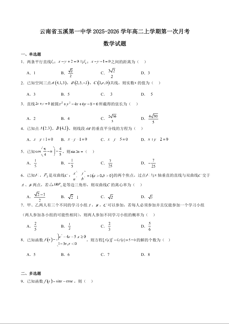高二数学+答案--云南省玉溪第一中学2025-2026学年高二上学期第一次月考