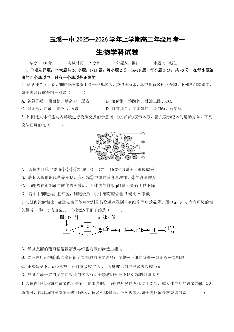 高二生物+答案--云南省玉溪第一中学2025-2026学年高二上学期第一次月考