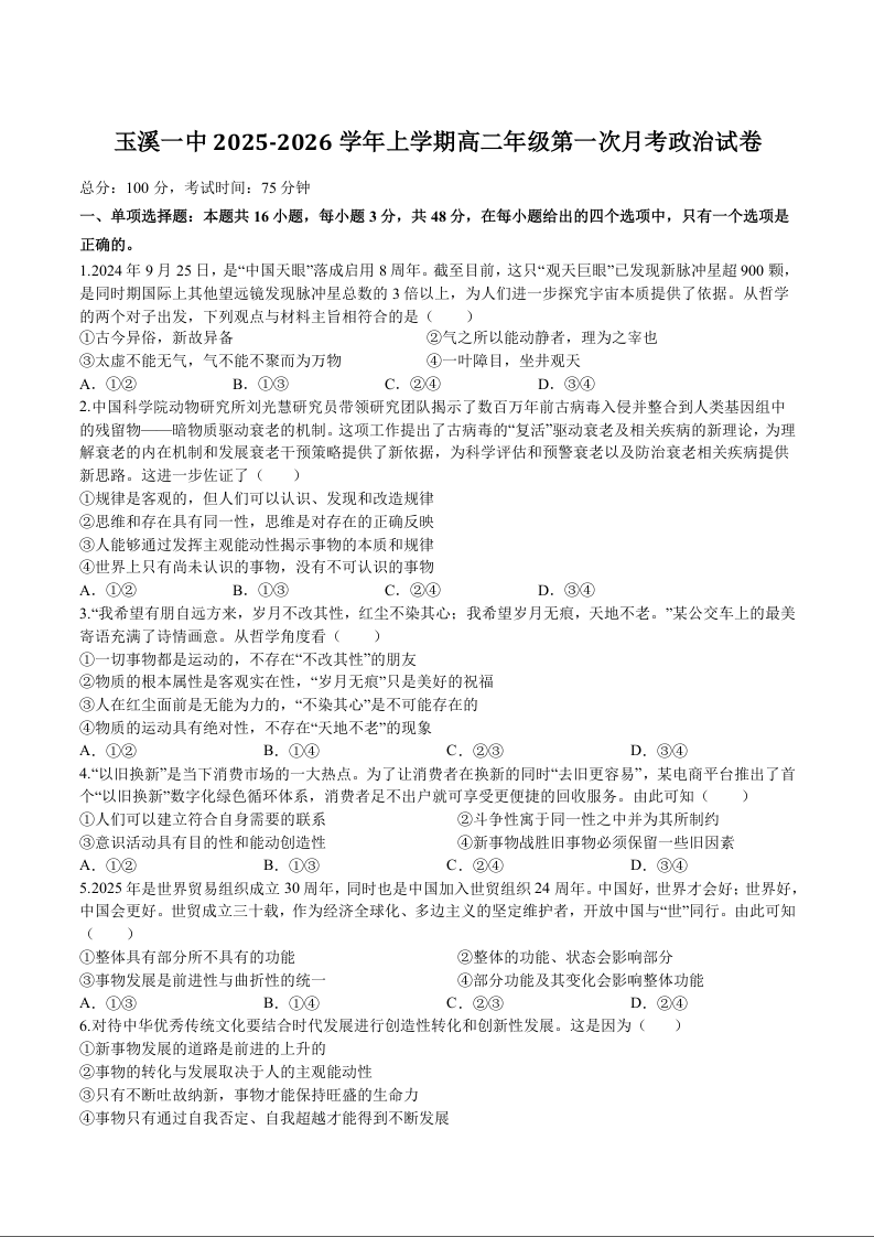 高二政治+答案--云南省玉溪第一中学2025-2026学年高二上学期第一次月考