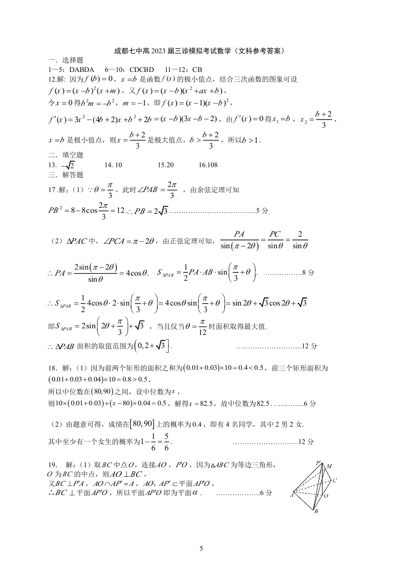 高三文数答案--四川省成都七中2023届三诊模拟考试