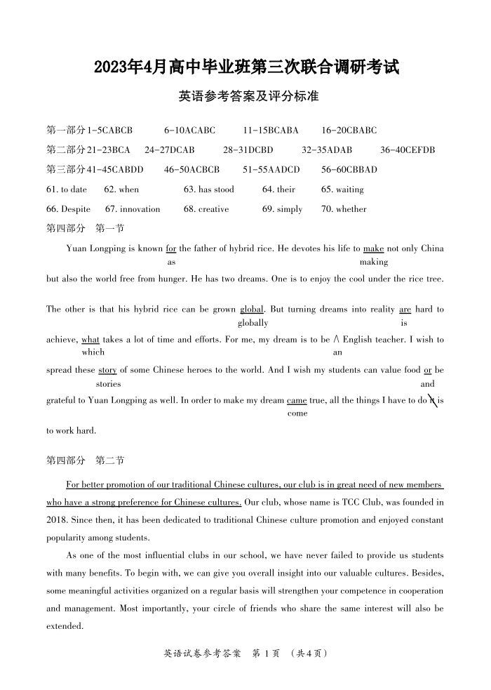 高三英语答案--广西2023届高中毕业班第三次联合调研考试