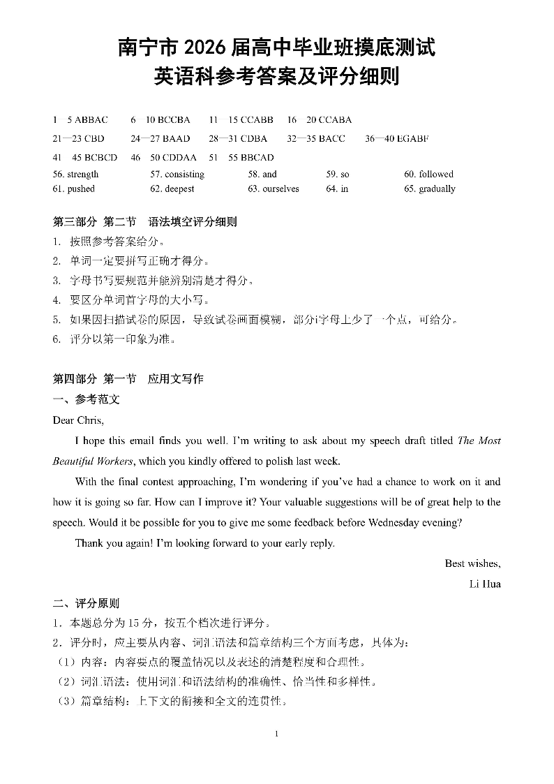 高三英语答案--广西省南宁市2026届高中毕业班10月摸底测试