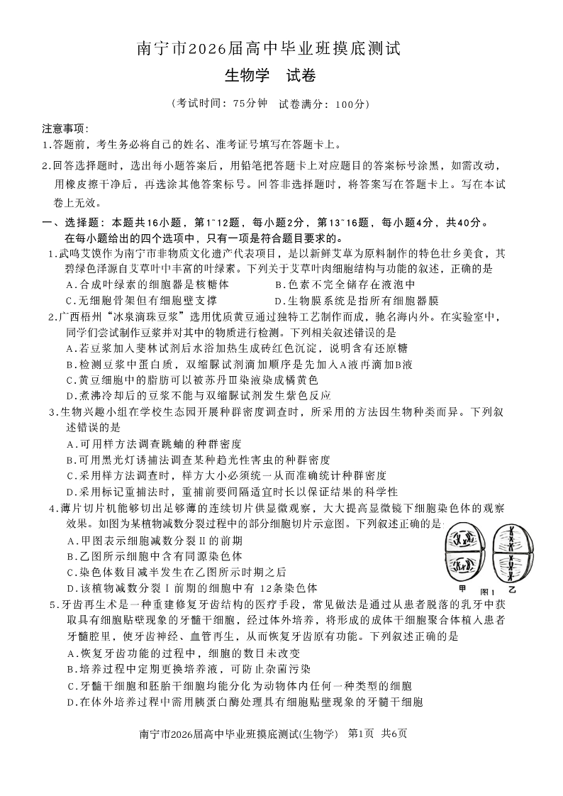 高三生物+答案--广西省南宁市2026届高中毕业班10月摸底测试