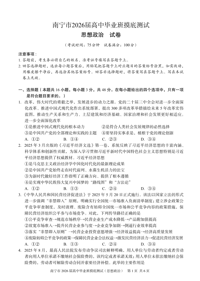 高三政治--广西省南宁市2026届高中毕业班10月摸底测试
