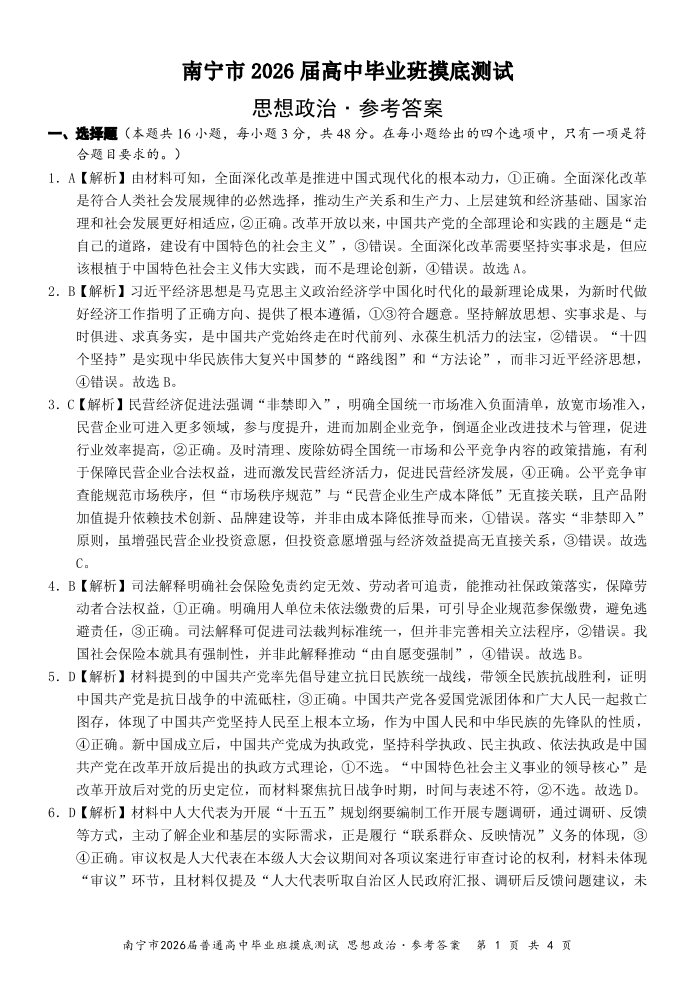 高三政治答案--广西省南宁市2026届高中毕业班10月摸底测试