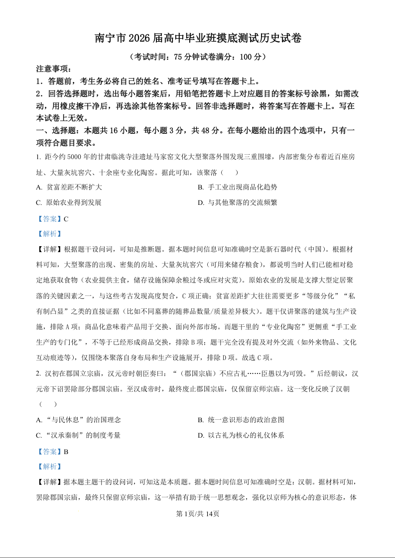 高三历史(精品解析版)--广西省南宁市2026届高中毕业班10月摸底测试