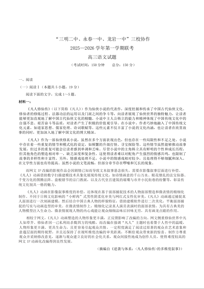 高三语文+答案--福建省三校(三明二中、永春一中、龙岩一中)2026届高三上学期10月联考