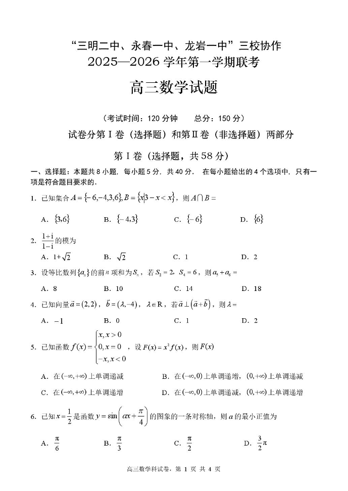 高三数学+答案--福建省三校(三明二中、永春一中、龙岩一中)2026届高三上学期10月联考