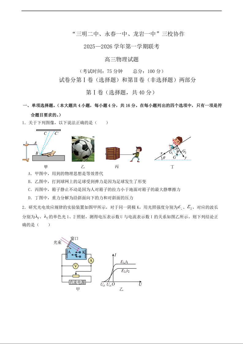 高三物理+答案--福建省三校(三明二中、永春一中、龙岩一中)2026届高三上学期10月联考