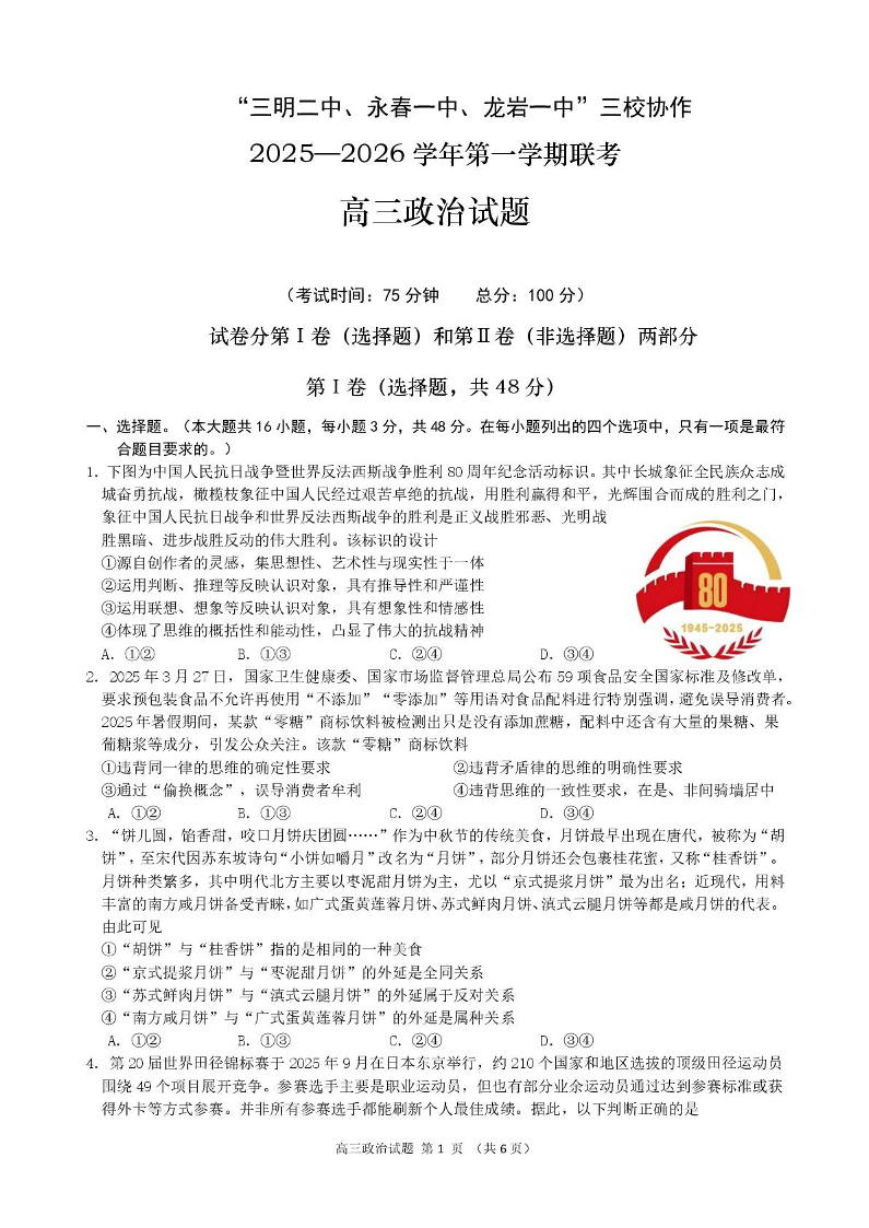 高三政治+答案--福建省三校(三明二中、永春一中、龙岩一中)2026届高三上学期10月联考