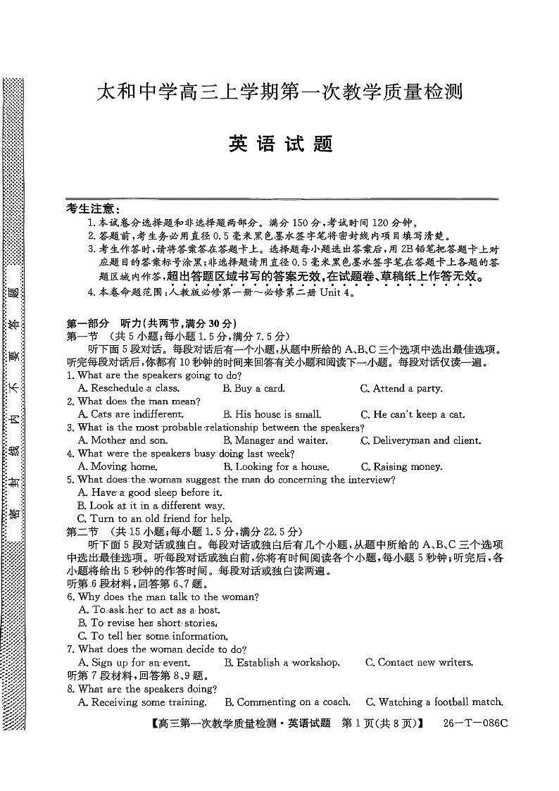 高三英语--安徽省阜阳市太和中学2026届高三上学期10月月考