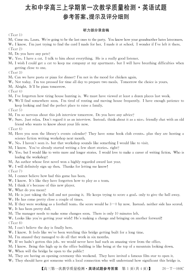 高三英语答案--安徽省阜阳市太和中学2026届高三上学期10月月考