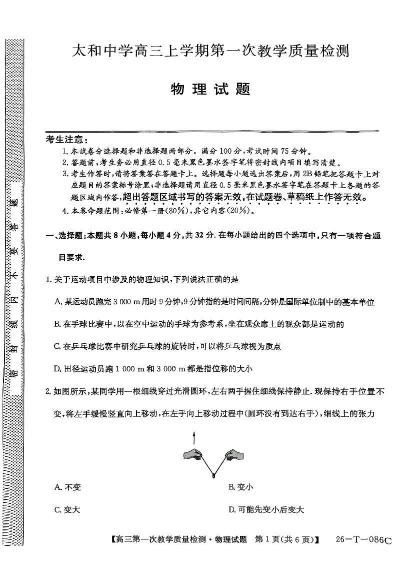 高三物理--安徽省阜阳市太和中学2026届高三上学期10月月考
