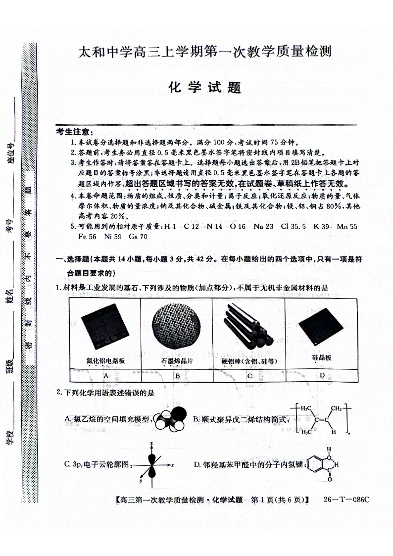 高三化学--安徽省阜阳市太和中学2026届高三上学期10月月考