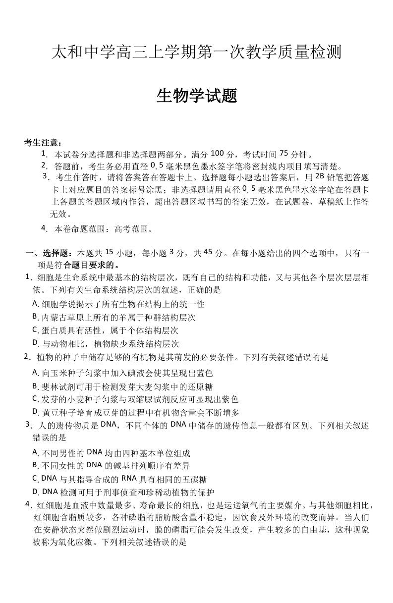 高三生物--安徽省阜阳市太和中学2026届高三上学期10月月考