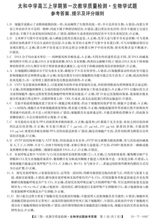 高三生物答案--安徽省阜阳市太和中学2026届高三上学期10月月考