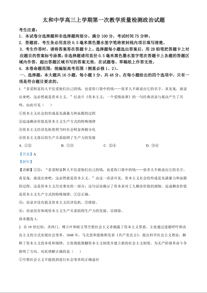 高三政治(解析版)--安徽省阜阳市太和中学2026届高三上学期10月月考