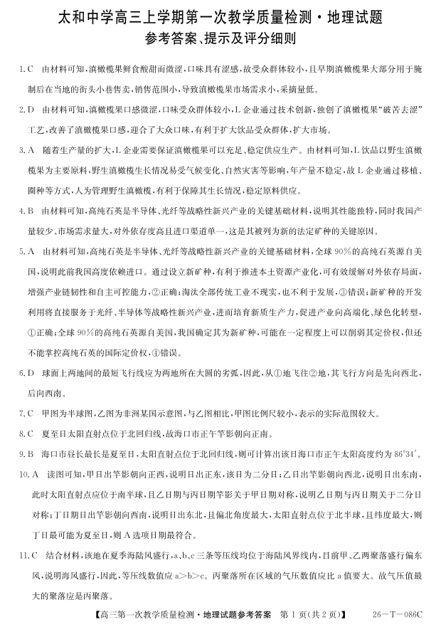 高三地理答案--安徽省阜阳市太和中学2026届高三上学期10月月考