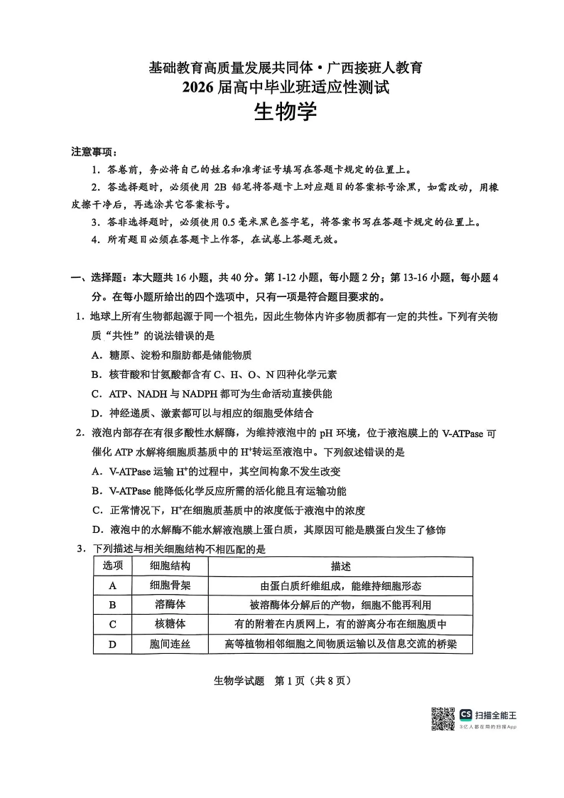 高三生物--广西接班人教育基础教育高质量发展共同体2026 届高中毕业班适应性测试