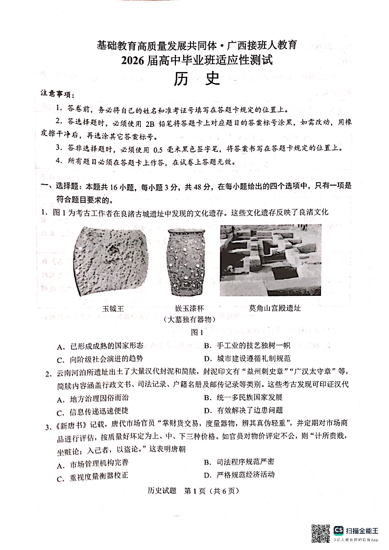 高三历史--广西接班人教育基础教育高质量发展共同体2026 届高中毕业班适应性测试