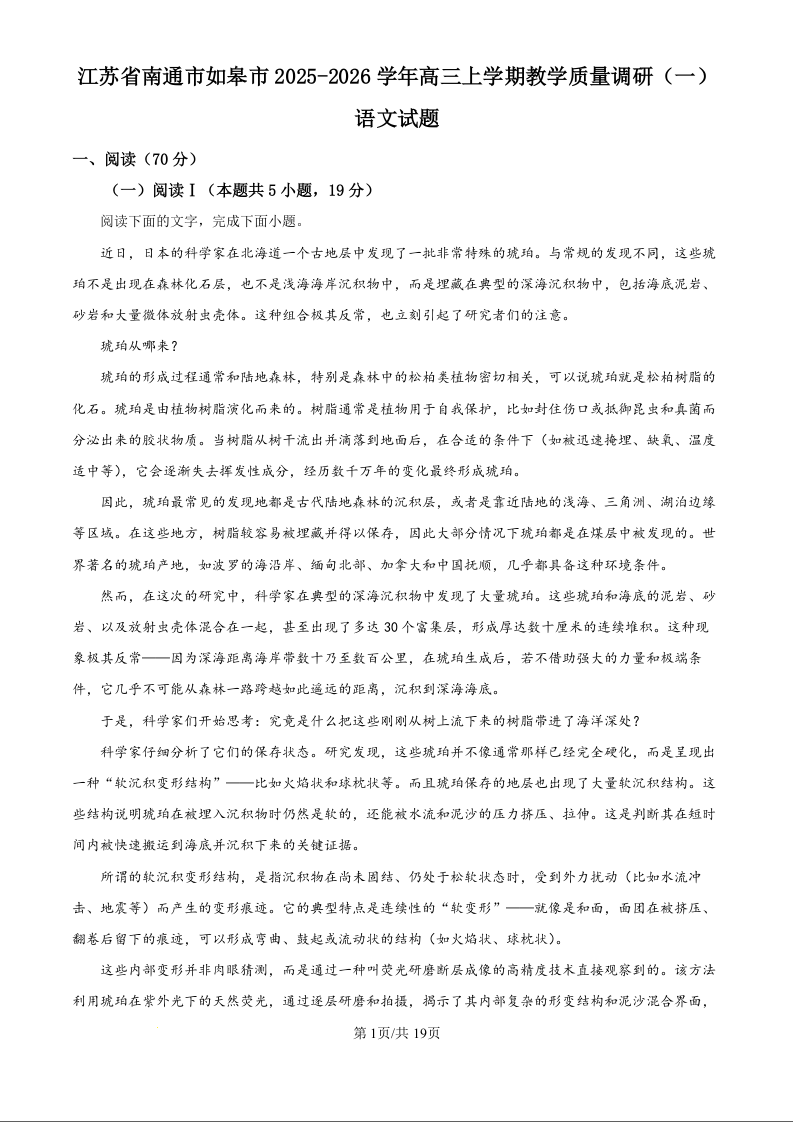 高三语文(精品解析版)--江苏省南通市如皋市2026届高三上学期教学质量调研(一)