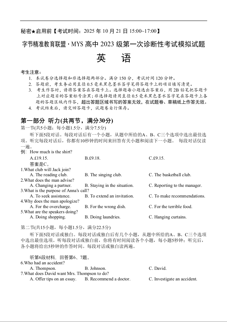 高三英语+答案--四川省字节精准教育联盟2026届高三上学期第一次诊断性考试模拟