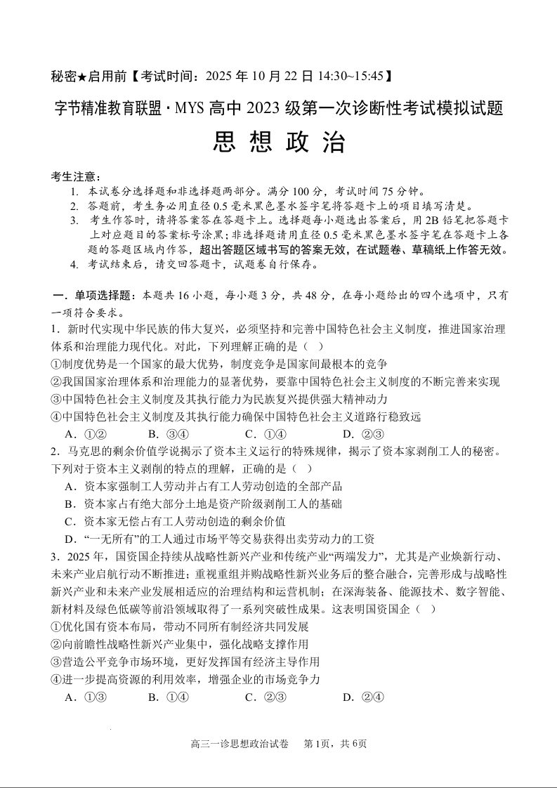 高三政治+答案--四川省字节精准教育联盟2026届高三上学期第一次诊断性考试模拟