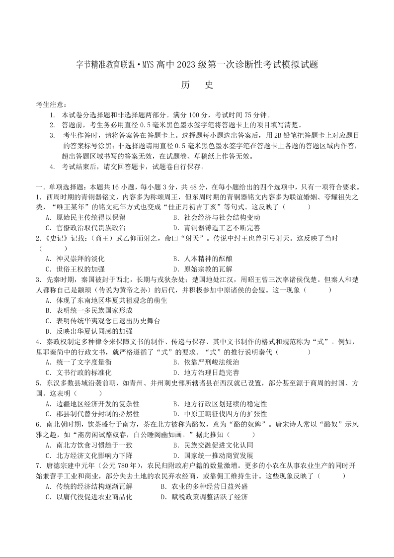 高三历史+答案--四川省字节精准教育联盟2026届高三上学期第一次诊断性考试模拟