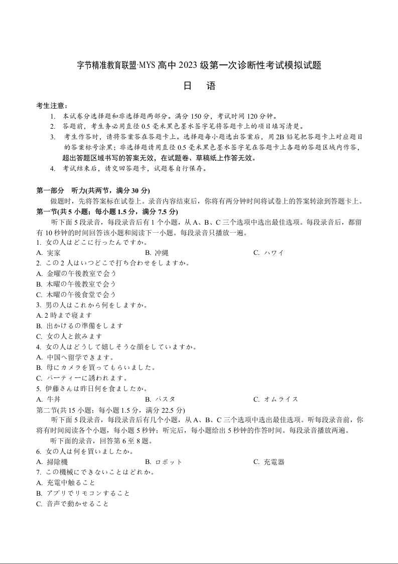 高三日语+答案--四川省字节精准教育联盟2026届高三上学期第一次诊断性考试模拟