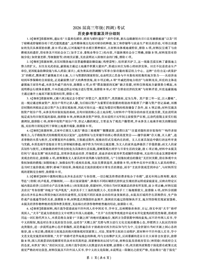 高三历史答案--河北省衡水市2026届高三上学期四调考试