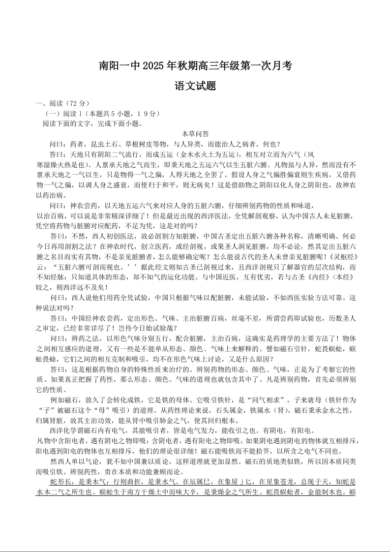 高三语文+答案--河南省南阳市第一中学2026届高三上学期第一次月考